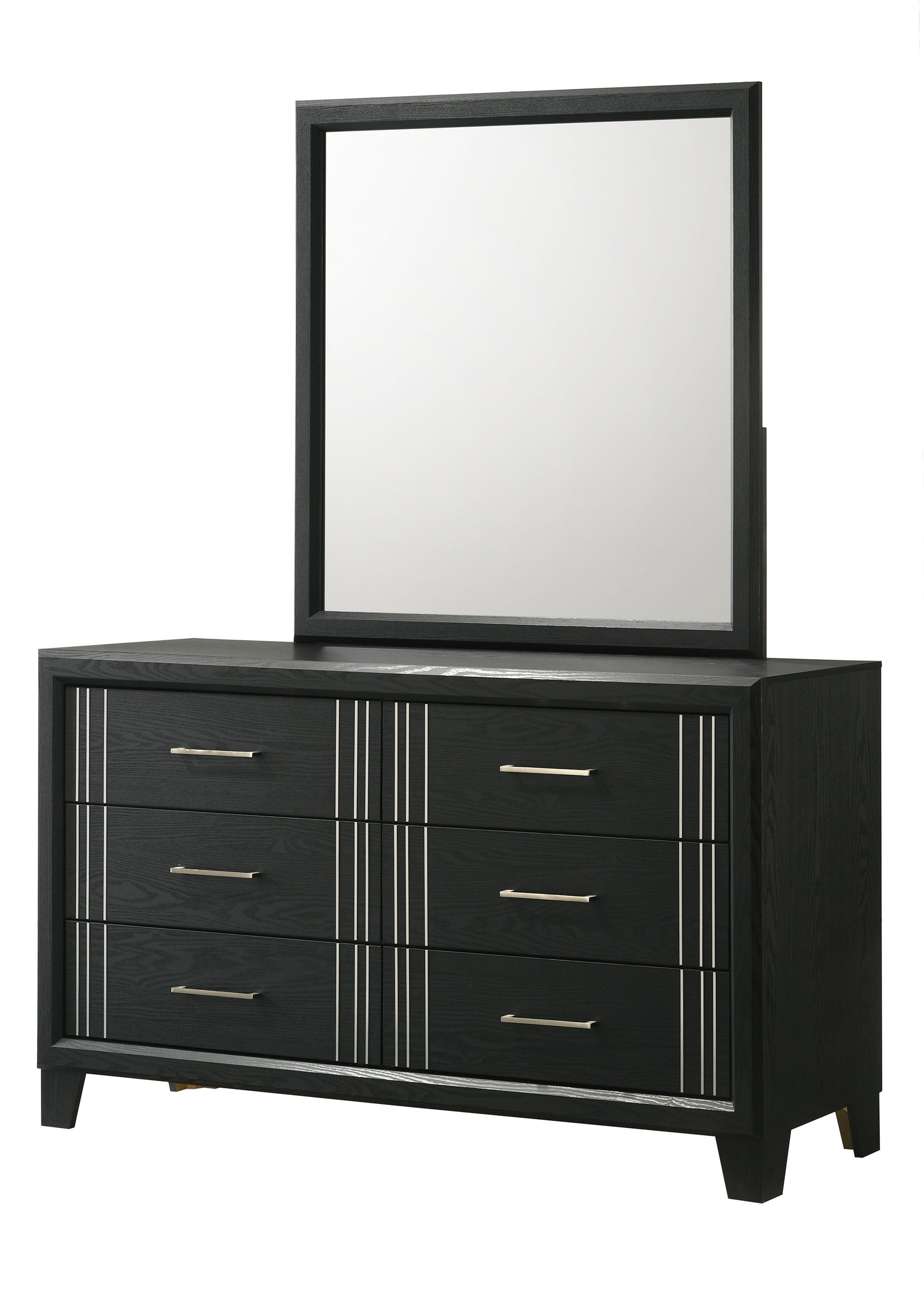 This elegant bedroom collection presents a sophisticated ensemble perfect for creating a refined modern aesthetic in your sleeping quarters. The suite features a sleek, minimalist design with crisp, clean lines and a rich finish that exudes contemporary charm. Anchoring the set is a robust panel bed with a prominent headboard, promising a sturdy and stylish centerpiece. Flanking the bed are complementary case pieces, offering ample storage with their smooth-gliding drawers accented with chic silver-toned hardware.