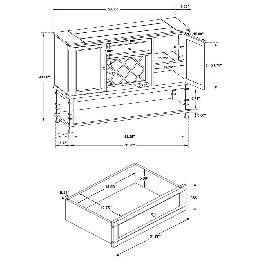 Deep and rich, this transitional classic server is great for a dining room. In a rustic espresso finish, the one-drawer and two door base are raised by tapered legs. The lower storage shelf and built-in wine bottle rack help to keep dinner essentials at hand. Dress up a neutral space with this dark server that is versatile and stylish. The smooth silhouette is given dimension with elevated edges.